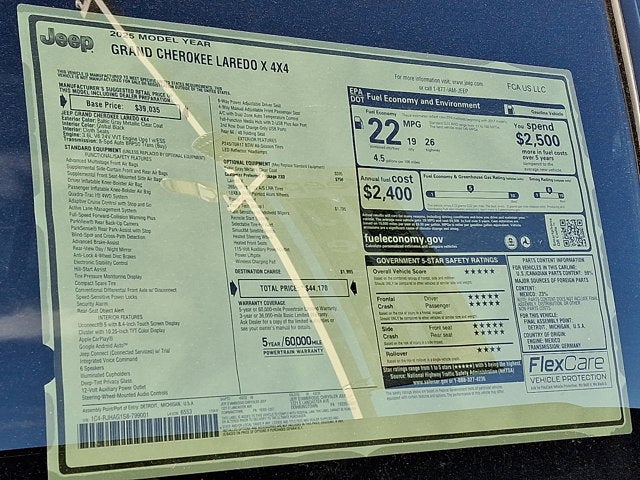 Below is all the standard equipment Luxury Tech Group I (115V Auxiliary Power Outlet, Heated Front Seats, Heated Steering Wheel, Power Liftgate, Rain Sensitive Windshield Wipers, Remote Start System, Satellite Radio, Secondary Active Grille Shutters, Selectable Tire Fill Alert, and Wireless Charging Pad), Quick Order Package 23D Laredo X (Laredo X, Power Sunroof, and Wheels: 18" x 8" Fully Painted Aluminum), 4WD, 4-Wheel Disc Brakes, 6 Speakers, ABS brakes, Air Conditioning, Alloy wheels, AM/FM radio: SiriusXM, Anti-whiplash front head restraints, Automatic temperature control, Brake assist, Bumpers: body-color, Cloth Seats, Compass, Delay-off headlights, Driver door bin, Driver vanity mirror, Dual front impact airbags, Dual front side impact airbags, Electronic Stability Control, Emergency communication system, Four wheel independent suspension, Front anti-roll bar, Front Bucket Seats, Front Center Armrest w/Storage, Front dual zone A/C, Front License Plate Bracket, Front reading lights, Fully automatic headlights, Heated door mirrors, Illuminated entry, Knee airbag, Low tire pressure warning, Model Year Tracking, Normal Duty Suspension, Occupant sensing airbag, Outside temperature display, Overhead airbag, Overhead console, Panic alarm, ParkView Rear Back-Up Camera, Passenger door bin, Passenger vanity mirror, Power door mirrors, Power driver seat, Power steering, Power windows, Radio data system, Radio: Uconnect 5 with 8.4" Display, Rear anti-roll bar, Rear reading lights, Rear window defroster, Rear window wiper, Remote keyless entry, Security system, Speed control, Speed-Sensitive Wipers, Split folding rear seat, Spoiler, Steering wheel mounted audio controls, Tachometer, Telescoping steering wheel, Tilt steering wheel, Traction control, Trip computer, Variably intermittent wipers, Voltmeter, and Wheels: 17" x 6.5" Fully Painted Aluminum.