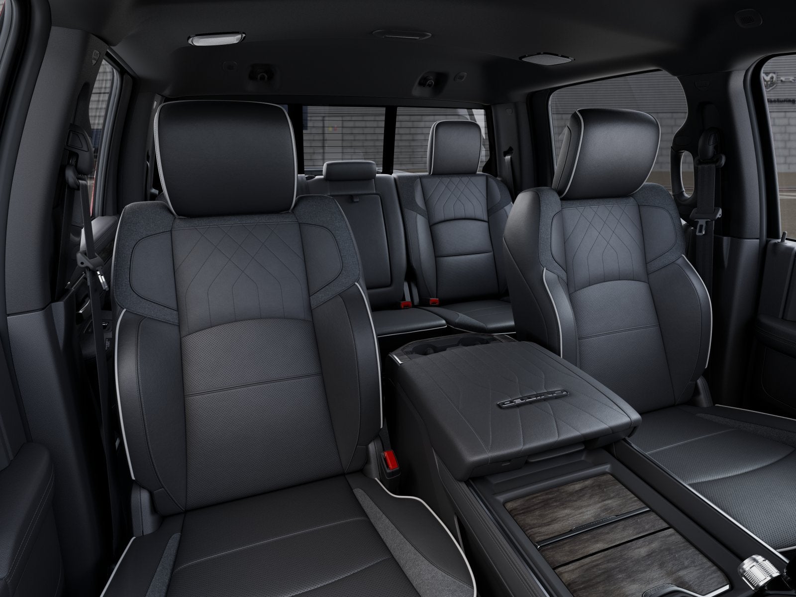 Below is all the standard equipment Limited Level 1 Equipment Group (Active Lane Management System, Adaptive Steering System, Anti-Spin Differential Rear Axle, Center Stop Lamp with Cargo View Camera, Digital Rearview Mirror, Drowsy Driver Detection, LED Bed Lighting, MOPAR Spray in Bedliner, Power Deployable Running Boards, Surround View Camera System, Traffic Sign Recognition, Trailer Reverse Guidance, and Trailer Tire Pressure Monitoring System), Night Edition (Black Exterior Truck Badging, Black Grille Limited, Black Interior Accents, Black Wheel Center Hub, Body Color Grille-Surround, Sport Performance Hood, and Wheels: 20" x 8.0" Night Edition Black Aluminum), Quick Order Package 24M Limited, RamBox Delete (Pickup Box, Vendor Painted Cargo Box, and Vendor Painted Cargo Box Tracking), 17 Speakers, 4-Wheel Disc Brakes, ABS brakes, Adjustable pedals, Air Conditioning, Alloy wheels, AM/FM radio: SiriusXM with 360L, Apple CarPlay/Android Auto, Audio memory, Auto High-beam Headlights, Auto Level Rear Air Suspension, Auto-dimming door mirrors, Auto-dimming Rear-View mirror, Automatic temperature control, Bodyside moldings, Brake assist, Bumpers: body-color, Clearance Lamps, Compass, Dash Pass Thru Wire Circuits, Delay-off headlights, Driver door bin, Driver vanity mirror, Dual Alternators Rated At 480 Amps, Dual front impact airbags, Dual front side impact airbags, Electronic Stability Control, Front anti-roll bar, Front Bucket Seats, Front Center Armrest w/Storage, Front dual zone A/C, Front fog lights, Front reading lights, Front Seat Back Map Pockets, Fully automatic headlights, Garage door transmitter, Genuine wood console insert, Genuine wood dashboard insert, Genuine wood door panel insert, harman/kardon® Speakers, Heated door mirrors, Heated front seats, Heated rear seats, Heated steering wheel, Illuminated entry, Instrument Panel Mounted Auxiliary Switches, Leather steering wheel, Low tire pressure warning, Memory seat, MOPAR Trailer Camera Wiring with No Camera, Navigation System, Occupant sensing airbag, Outside temperature display, Overhead airbag, Overhead console, Panic alarm, ParkView Rear Back-Up Camera, Passenger door bin, Passenger vanity mirror, Pedal memory, Power door mirrors, Power driver seat, Power passenger seat, Power steering, Power windows, Radio data system, Radio: Uconnect 5 Nav with 14.4" Display, Rain sensing wipers, Rear anti-roll bar, Rear reading lights, Rear seat center armrest, Rear step bumper, Rear window defroster, Remote keyless entry, Security system, Speed control, Split folding rear seat, Steering wheel mounted audio controls, Tachometer, Tilt steering wheel, Traction control, Trip computer, Turn signal indicator mirrors, Ultra Premium Leather Seats, Variably intermittent wipers, Ventilated Front Seats, Ventilated front seats, Voltmeter, and Wheels: 20" x 8.0" Diamond Cut Aluminum with Black Pt Pockets.