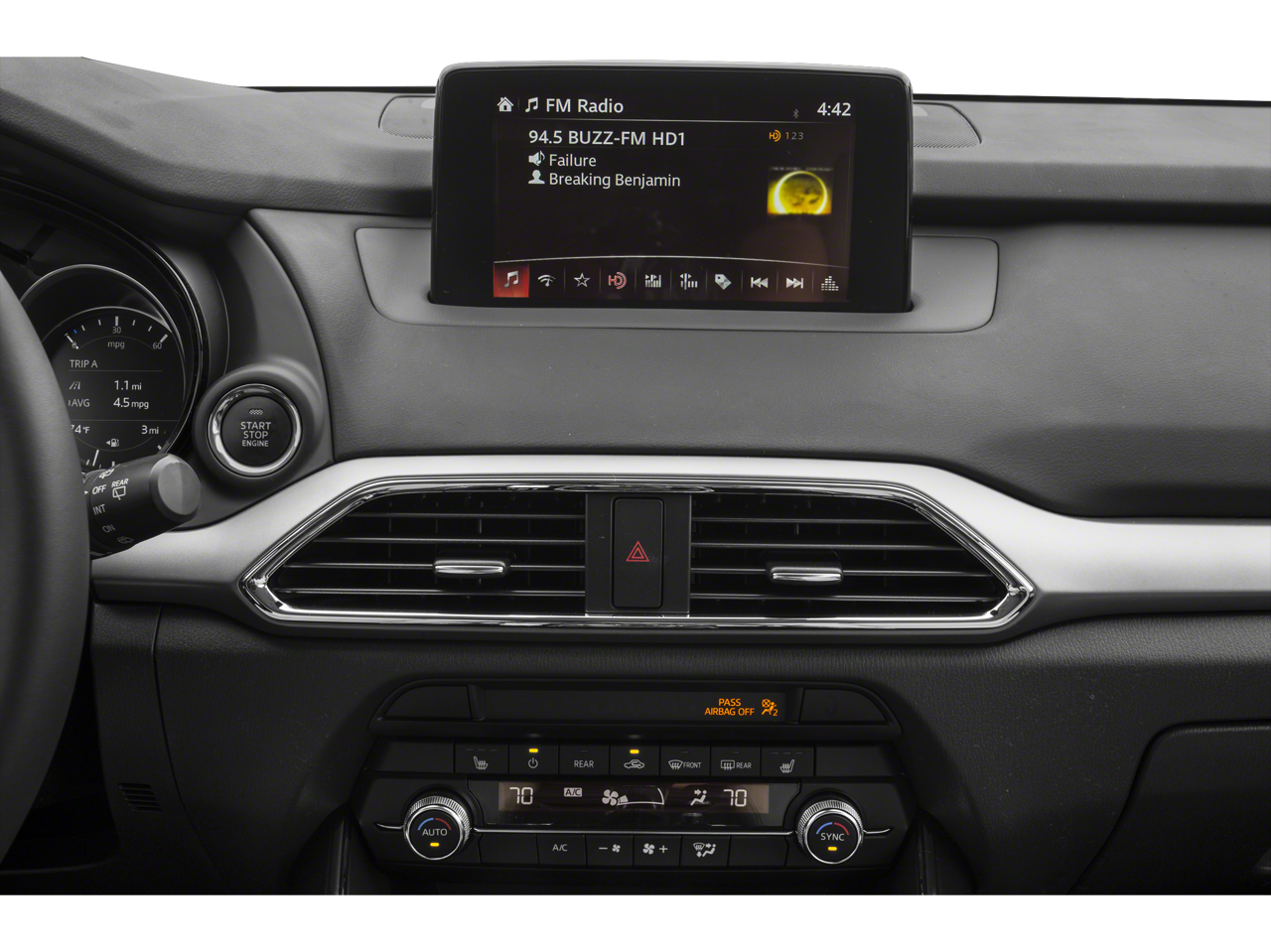 Below is all the standard equipment Touring Premium Package (2nd Row Retractable Window Sunshade, Bose Premium Audio w/12 speakers, Front Parking Sensor, LED Foglights, Mazda Navigation System, Power Sliding Glass Moonroof w/Interior Sunshade, Rear Backup Sensor, and SiriusXM Satellite Radio), AWD, 3rd row seats: bench, 4-Wheel Disc Brakes, 6 Speakers, ABS brakes, Aha Internet Radio, Air Conditioning, Alloy wheels, AM/FM radio, AppLink/Apple CarPlay and Android Auto, Auto High-beam Headlights, Auto-dimming Rear-View mirror, Automatic temperature control, Axle Ratio: 4.411, Brake assist, Bumpers: body-color, Compass, Delay-off headlights, Driver door bin, Driver vanity mirror, Dual front impact airbags, Dual front side impact airbags, E911 Automatic Emergency Notification, Electronic Stability Control, Emergency communication system: MAZDA CONNECT, Exterior Parking Camera Rear, Four wheel independent suspension, Front anti-roll bar, Front Bucket Seats, Front Center Armrest, Front dual zone A/C, Front reading lights, Fully automatic headlights, Garage door transmitter: HomeLink, Heated door mirrors, Heated Front Bucket Seats, Heated front seats, Illuminated entry, Infotainment System Voice Command, Leather Shift Knob, Leather steering wheel, Leather-Trimmed Seats, Low tire pressure warning, Occupant sensing airbag, Outside temperature display, Overhead airbag, Overhead console, Pandora Internet Radio, Panic alarm, Passenger door bin, Passenger vanity mirror, Power door mirrors, Power driver seat, Power Liftgate, Power passenger seat, Power steering, Power windows, Radio Broadcast Data System Program Information, Radio data system, Radio: AM/FM Sound System, Rain sensing wipers, Rear air conditioning, Rear anti-roll bar, Rear reading lights, Rear seat center armrest, Rear window defroster, Rear window wiper, Remote keyless entry, SMS Text Msg Audio Delivery & Reply, Speed control, Speed-sensing steering, Split folding rear seat, Spoiler, Steering wheel mounted audio controls, Stitcher Internet Radio, Tachometer, Telescoping steering wheel, Tilt steering wheel, Traction control, Trip computer, Turn signal indicator mirrors, Variably intermittent wipers, and Wheels: 18 x 8J Aluminum Alloy. Awards: