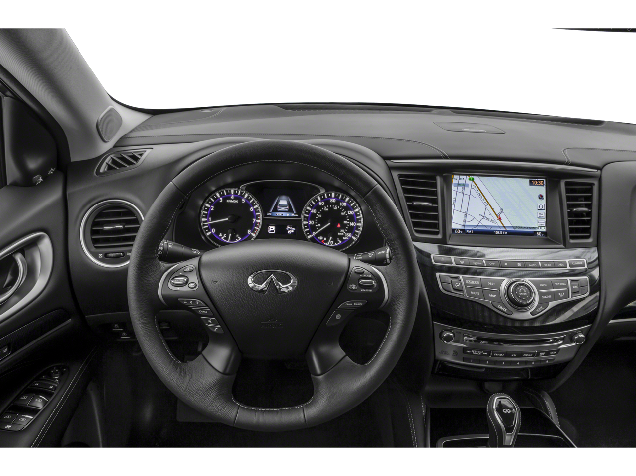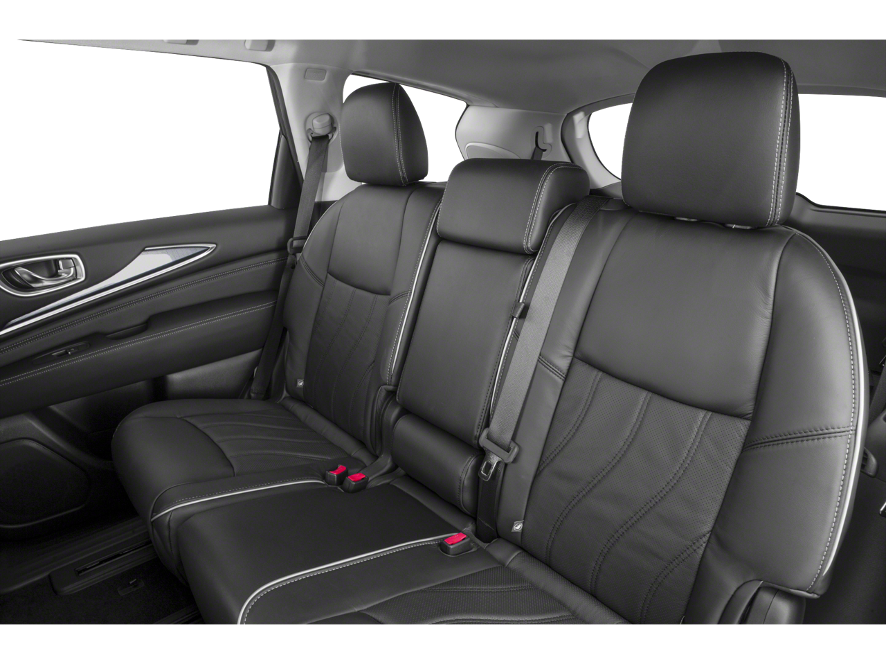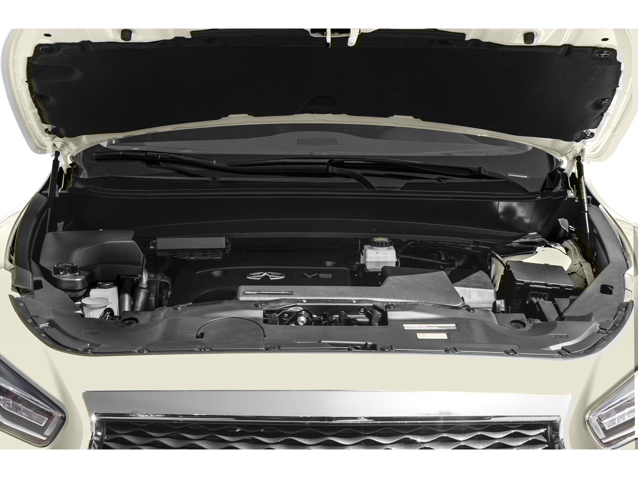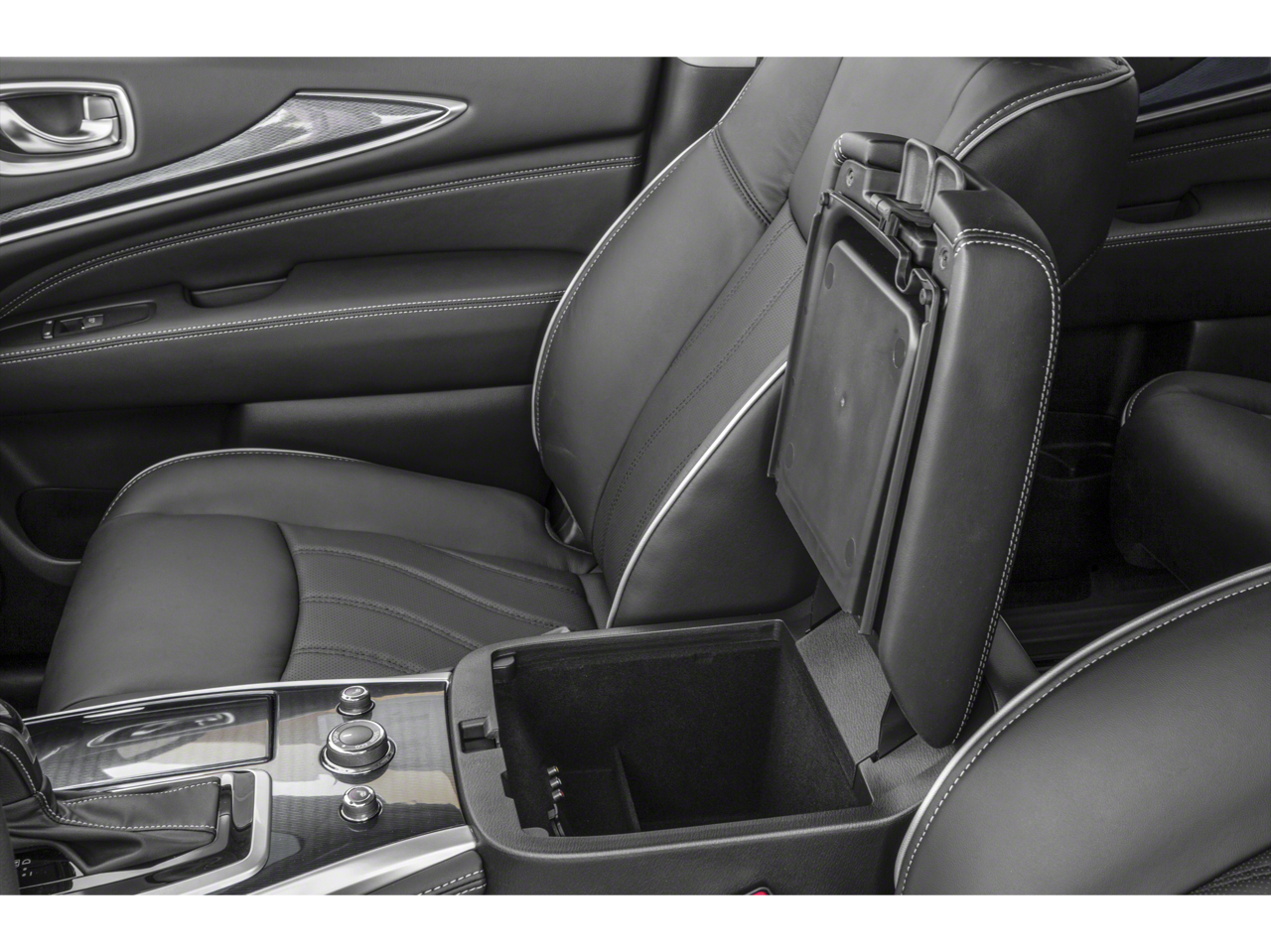 Below is all the standard equipment Cargo Package Essential (Cargo Protector, Console Net, First Aid Kit, and Rear Cargo Cover), Essential Package (Around View Monitor w/Moving Object Detection, Front & Rear Sonar System (2FR/2RR), Illuminated Kick Plates (IKP), INFINITI InTouch w/Navigation & InTouch Services, Leather-Appointed Seat Trim, Rain-Sensing Front Windshield Wipers, and Voice Recognition for Navigation Functions), 13 Speakers, 3rd row seats: bench, 4-Wheel Disc Brakes, 5.25 Axle Ratio, ABS brakes, Air Conditioning, Alloy wheels, AM/FM radio: SiriusXM, Anti-whiplash front head restraints, Auto-dimming Rear-View mirror, Automatic temperature control, Bodyside moldings, Brake assist, Bumpers: body-color, Carpeted Floor Mats (4-Piece Set), CD player, Delay-off headlights, Driver door bin, Driver vanity mirror, Dual front impact airbags, Dual front side impact airbags, Electronic Stability Control, Four wheel independent suspension, Front anti-roll bar, Front Bucket Seats, Front Center Armrest w/Storage, Front dual zone A/C, Front fog lights, Front reading lights, Fully automatic headlights, Garage door transmitter: HomeLink, Heated door mirrors, Heated Front Seats, Heated front seats, Heated steering wheel, Illuminated entry, Illuminated Kick Plates (K11), Leather steering wheel, Leatherette Seat Trim, Literature Kit, Low tire pressure warning, Memory seat, Occupant sensing airbag, Outside temperature display, Overhead airbag, Overhead console, Panic alarm, Passenger door bin, Passenger vanity mirror, Power door mirrors, Power driver seat, Power Liftgate, Power moonroof, Power passenger seat, Power steering, Power windows, Radio data system, Radio: AM/FM/CD/DVD w/Bose Premium Audio System, Rear air conditioning, Rear anti-roll bar, Rear Bumper Protector, Rear reading lights, Rear seat center armrest, Rear window defroster, Rear window wiper, Reclining 3rd row seat, Remote keyless entry, Roof rack: rails only, Security system, Speed control, Speed-sensing steering, Speed-Sensitive Wipers, Splash Guards (Color Matched, Set of 4), Split folding rear seat, Spoiler, Steering wheel memory, Steering wheel mounted audio controls, Tachometer, Telescoping steering wheel, Tilt steering wheel, Traction control, Trip computer, Turn signal indicator mirrors, Variably intermittent wipers, and Wheels: 18 Triple 5-Spoke Aluminum-Alloy. Awards: