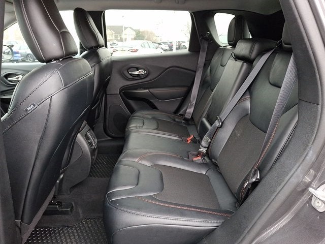 Below is all the standard equipment Comfort/Convenience Group (Auto-Dimming Rear-View Mirror, Hands-Free Power Liftgate, Security Alarm, and Universal Garage Door Opener), Quick Order Package 27E, FCA US LLC Certified Pre-Owned Certified, Wheels: 17 x 7.5 Painted Diamond Cut Aluminum, 3.517 Final Drive Ratio, 4-Wheel Disc Brakes, 4G LTE Wi-Fi Hot Spot, 6 Speakers, 8.4 Touchscreen Display, ABS brakes, Air Conditioning, Alloy wheels, AM/FM radio: SiriusXM, Anti-whiplash front head restraints, Apple CarPlay, Apple CarPlay/Android Auto, Automatic temperature control, Brake assist, Cloth/Premium Vinyl Bucket Seats, Compass, Delay-off headlights, Driver door bin, Driver vanity mirror, Dual front impact airbags, Dual front side impact airbags, Electronic Stability Control, For Details, Visit DriveUconnect.com, For More Info, Call 800-643-2112, Four wheel independent suspension, Front anti-roll bar, Front Bucket Seats, Front Center Armrest, Front dual zone A/C, Front fog lights, Front License Plate Bracket, Front reading lights, Fully automatic headlights, Google Android Auto, GPS Antenna Input, Heated door mirrors, Heated front seats, Heated steering wheel, Illuminated entry, K-Black Door Trim Panel Appliques, K-Black Interior Accents, Knee airbag, Leather Shift Knob, Low tire pressure warning, Occupant sensing airbag, Off Road Suspension, Outside temperature display, Overhead airbag, Overhead console, Panic alarm, ParkView Rear Back-Up Camera, Passenger door bin, Passenger vanity mirror, Power door mirrors, Power driver seat, Power steering, Power windows, Radio data system, Radio: Uconnect 4 w/8.4 Display, Rain sensing wipers, Rear anti-roll bar, Rear reading lights, Rear seat center armrest, Rear side impact airbag, Rear window defroster, Rear window wiper, Remote keyless entry, Roof rack: rails only, SiriusXM Radio Service, SiriusXM Satellite Radio, Speed control, Speed-sensing steering, Split folding rear seat, Spoiler, Steering wheel mounted audio controls, Tachometer, Telescoping steering wheel, Tilt steering wheel, Traction control, Trip computer, Turn signal indicator mirrors, USB Host Flip, Variably intermittent