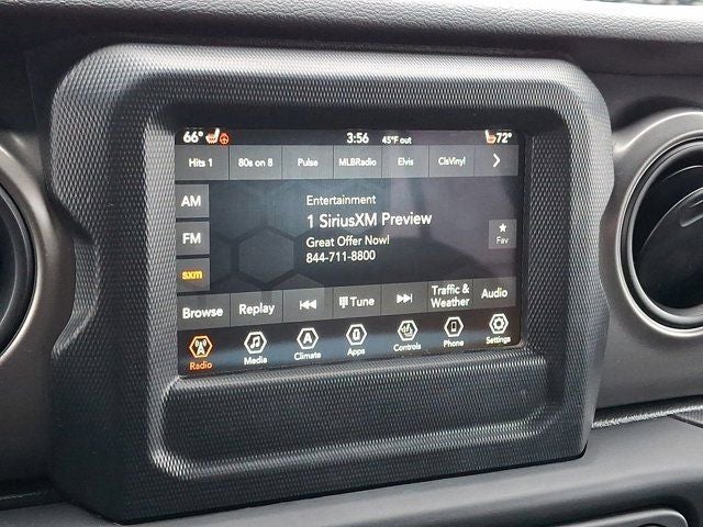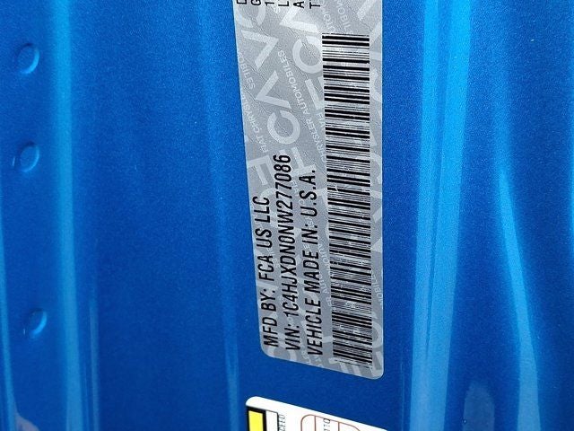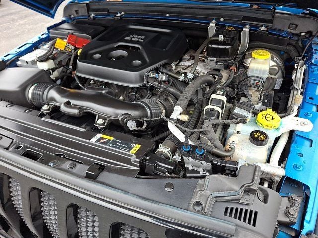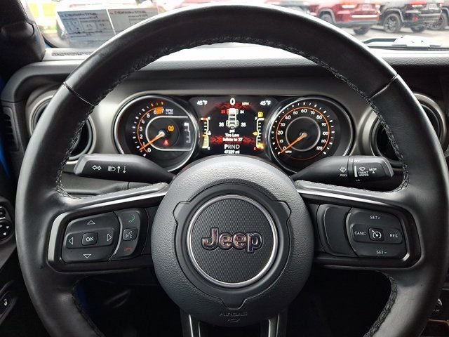 Below is all the standard equipment Cold Weather Group (Heated Front Seats, Heated Steering Wheel, and Leather Wrapped Steering Wheel), Convenience Group (Universal Garage Door Opener), LED Headlamp & Fog Lamp Group (Front LED Fog Lamps and LED Premium Reflector Headlamps), Quick Order Package 22W Willys (4-Wheel Drive Swing Gate Decal, 97 MPH Vehicle Max Speed Calibration, Anti-Spin Differential Rear Axle, Automatic Headlamps, Black Grille, Black Trail Rated Badge, Deep Tint Sunscreen Windows, Front 1-Touch Down Power Windows, Matte Black Jeep Badge, Mold In Color Bumper w/Gloss Black, MOPAR All-Weather Floor Mats, Power Heated Mirrors, Remote Keyless Entry, Security Alarm, Speed Sensitive Power Locks, Sun Visors w/Illuminated Vanity Mirrors, Wheels: 17 x 7.5 Moab Black Aluminum, Willys, and Willys Hood Decal), Technology Group (2-Door Passive Entry, Front Door Locks, Air Conditioning w/Auto Temperature Control, Air Filtering, Cluster 7.0 TFT Color Display, SiriusXM Radio Service, and SiriusXM Satellite Radio), FCA US LLC Certified Pre-Owned Certified, 110 MPH Vehicle Max Speed Calibration, 3.45 Rear Axle Ratio, 4-Wheel Disc Brakes, 8 Speakers, ABS brakes, Air Conditioning, AM/FM radio, Apple CarPlay/Android Auto, Aux Battery, Brake assist, Cloth Low-Back Bucket Seats, Compass, Delay-off headlights, Driver door bin, Driver vanity mirror, Dual front impact airbags, Dual front side impact airbags, Electronic Stability Control, Emergency communication system: SiriusXM Guardian, Engine Oil Cooler, Front anti-roll bar, Front Bucket Seats, Front Center Armrest w/Storage, Front fog lights, Front reading lights, Integrated roll-over protection, Low tire pressure warning, Non-Lock Fuel Cap w/o Discriminator, Normal Duty Suspension, Occupant sensing airbag, Outside temperature display, ParkView Rear Back-Up Camera, Passenger door bin, Passenger vanity mirror, Power steering, Premium Black Sunrider Soft Top, Radio data system, Radio: Uconnect 4 w/7 Display, Rear anti-roll bar, Rear reading lights, Speed control, Split folding rear seat, Steering wheel mounted audio controls, Stop-Start Dual Battery System, Tachometer, Telescoping steering wheel, Tilt steering wheel, Traction control, Trip com