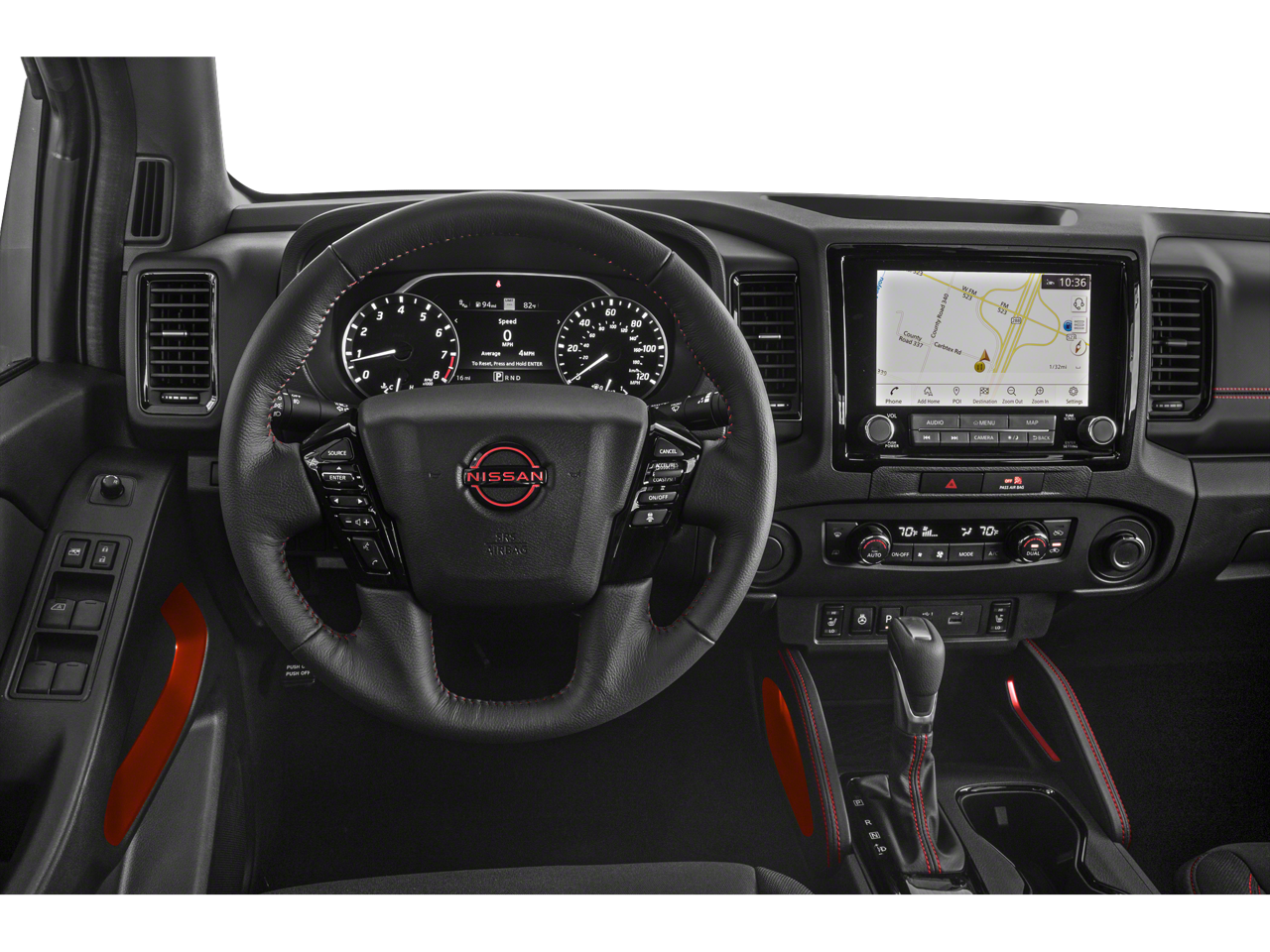 Below is all the standard equipment Off-Road Protection Package, PRO Convenience Package (120V Power Outlet in Bed, 120V Power Outlet in Rear Center Console, Bed Under-Rail Lighting, Heated Front Seats, Heated Outside Mirrors, Heated Steering Wheel, Intelligent Around View Monitor (I-AVM), Remote Engine Starter, Spray-In Bedliner, Trailer Hitch w/Wiring Harness, Utili-Track System, and Wireless Charging For Personal Devices), PRO-4X Premium Package (17 Accessory Dark Beadlock Style Alloy Wheels, Auto-Dimming Mirror, Auto-Tilt & Slide Sunroof w/Manual Shade, Fender Premium Audio System w/10 Speakers, Front & Rear Leather Seat Trim (1st/2nd Rows), HomeLink UGDO, and Partial Under-Seat Storage Delete), Technology Package (Blind Spot Warning, High Beam Assist (HBA), Intelligent Cruise Control, Lane Departure Warning System, Rear Automatic Braking (RAB), Rear Cross Traffic Alert (RCTA), and Rear Sonar System), Tow Package: Hitch, Tow Harness, 4WD, 3.692 Axle Ratio, 4-Wheel Disc Brakes, 6 Speakers, ABS brakes, Air Conditioning, Alloy wheels, AM/FM radio: SiriusXM, Anti-whiplash front head restraints, Automatic temperature control, Brake assist, Bumpers: body-color, Delay-off headlights, Driver door bin, Driver vanity mirror, Dual front impact airbags, Dual front side impact airbags, Electronic Stability Control, Electronic Tailgate Lock, Emergency communication system: NissanConnect Services, Front anti-roll bar, Front Bucket Seats, Front Center Armrest, Front dual zone A/C, Front fog lights, Front reading lights, Front wheel independent suspension, Fully automatic headlights, Illuminated entry, Knee airbag, Leather Shift Knob, Low tire pressure warning, Navigation system: Nissan Navigation with Voice Recognition, Occupant sensing airbag, Off-Road Style Step Rails, Overhead airbag, Overhead console, Panic alarm, Passenger door bin, Passenger vanity mirror, Power door mirrors, Power driver seat, Power steering, Power windows, PRO Embroidered Premium Cloth Seat Trim, PRO-4X Carpeted Floor Mats, PRO-4X Mud Flaps, Radio data system, Radio: SXM/AM/FM/AUX/USB Audio System w/6 Speakers, Rear anti-roll bar, Rear seat center armrest, Rear step bumper, Remote keyless entry, Security system, Speed control, Speed-sensing steering, Split folding rear seat, Steering wheel mounted audio controls, Tachometer, Tilt steering wheel, Traction control, Trip computer, Variably intermittent wipers, and Voltmeter.