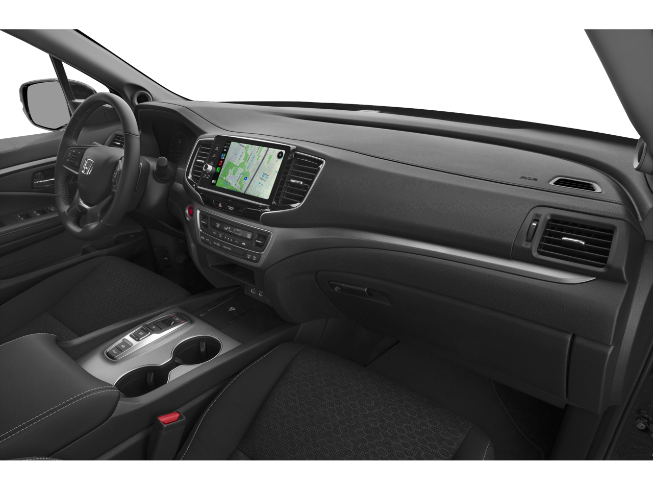 Below is all the standard equipment Black w/Cloth Seat Trim, 4-Wheel Disc Brakes, 4.33 Axle Ratio, 7 Speakers, ABS brakes, Air Conditioning, Alloy wheels, AM/FM radio, Automatic temperature control, Blind Spot Information (BSI) System warning, Bluetooth® Hands-Free Link, Brake assist, Bumpers: body-color, Cloth Seat Trim, Delay-off headlights, Driver door bin, Driver vanity mirror, Driver's Seat Mounted Armrest, Dual front impact airbags, Dual front side impact airbags, Electronic Stability Control, Emergency communication system: HondaLink Assist, Exterior Parking Camera Rear, Four wheel independent suspension, Front anti-roll bar, Front Bucket Seats, Front dual zone A/C, Front fog lights, Fully automatic headlights, Illuminated entry, Low tire pressure warning, Occupant sensing airbag, Outside temperature display, Overhead airbag, Overhead console, Panic alarm, Passenger door bin, Passenger seat mounted armrest, Passenger vanity mirror, Power door mirrors, Power steering, Power windows, Radio data system, Radio: 215-Watt Audio System w/7 Speakers, Rear air conditioning, Rear anti-roll bar, Rear reading lights, Rear seat center armrest, Rear step bumper, Rear window defroster, Remote keyless entry, Security system, Speed control, Speed-sensing steering, Split folding rear seat, Steering wheel mounted audio controls, Tachometer, Telescoping steering wheel, Tilt steering wheel, Traction control, Trip computer, Variably intermittent wipers, Wheels: 18 Shark Gray Alloy, and Wireless Apple CarPlay/Wireless Android Auto.
