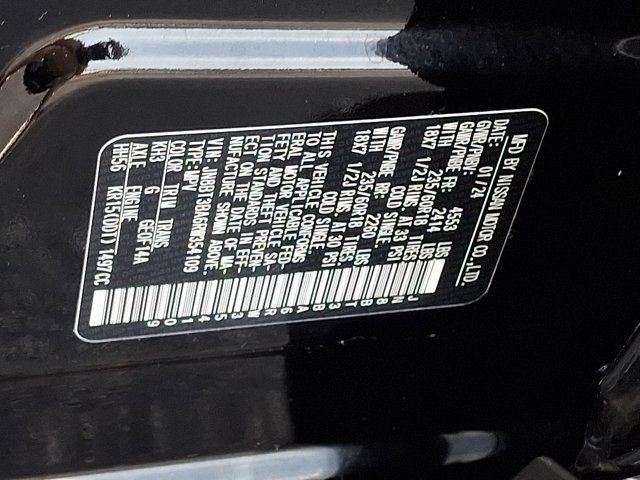 Below is all the standard equipment 4-Wheel Disc Brakes, 5.676 Axle Ratio, 6 Speakers, ABS brakes, Air Conditioning, Alloy wheels, AM/FM radio: SiriusXM, Auto High-beam Headlights, Automatic temperature control, Black Splash Guards (Set of 4), Brake assist, Bumpers: body-color, Chrome Rear Bumper Protector, Cloth Seat Trim w/Patterned Inserts, Delay-off headlights, Driver door bin, Driver vanity mirror, Dual front impact airbags, Dual front side impact airbags, Electronic Stability Control, Emergency communication system: NissanConnect Services, First Aid Kit, Floor Mats w/1-Piece Cargo Area Protector, Four wheel independent suspension, Frameless Rearview Mirror w/Universal Remote, Front anti-roll bar, Front Bucket Seats, Front Center Armrest, Front dual zone A/C, Front reading lights, Fully automatic headlights, Heated door mirrors, Illuminated entry, Illuminated Kick Plates, Knee airbag, Low tire pressure warning, NissanConnect featuring Apple CarPlay and Android Auto, Occupant sensing airbag, Outside temperature display, Overhead airbag, Overhead console, Panic alarm, Passenger door bin, Passenger vanity mirror, Power door mirrors, Power driver seat, Power Liftgate, Power steering, Power windows, Radio data system, Radio: AM/FM NissanConnect, Rear anti-roll bar, Rear Parking Sensors, Rear seat center armrest, Rear side impact airbag, Rear window defroster, Rear window wiper, Remote keyless entry, Speed control, Speed-Sensitive Wipers, Split folding rear seat, Spoiler, Steering wheel mounted audio controls, Tachometer, Telescoping steering wheel, Tilt steering wheel, Traction control, Trip computer, Variably intermittent wipers, and Wheels: 18 Dark Painted Machine Finished Alloy.