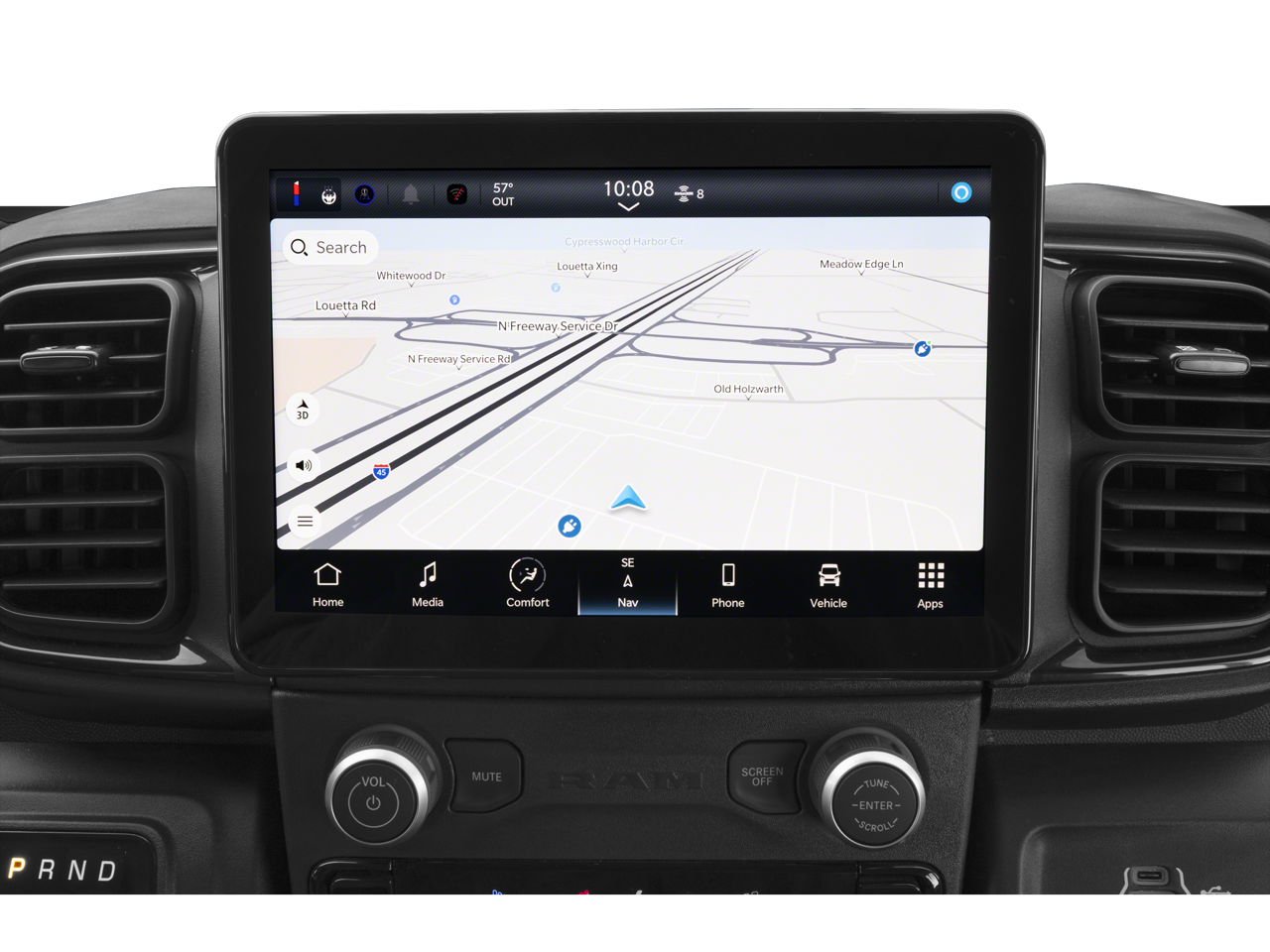 Below is all the standard equipment Quick Order Package 24A, Navigation System, 10.09 Axle Ratio, 16 x 6 Steel Wheels, 4 Speakers, 4-Wheel Disc Brakes, ABS brakes, Air Conditioning, AM/FM radio: SiriusXM, Apple CarPlay/Android Auto, Auto High-beam Headlights, Auto-dimming Rear-View mirror, Bodyside moldings, Brake assist, Cloth Flat Driver's Seat, Driver door bin, Driver's Seat Mounted Armrest, Dual front impact airbags, Electronic Stability Control, Emergency communication system, Front anti-roll bar, Front fog lights, Front License Plate Bracket, Front reading lights, Front wheel independent suspension, Fully automatic headlights, Heated door mirrors, Heavy Duty Suspension, Illuminated entry, Leather steering wheel, Low tire pressure warning, Manufacturer's Statement of Origin, Occupant sensing airbag, Outside temperature display, Overhead airbag, Overhead console, ParkView Rear Back-Up Camera, Passenger door bin, Power door mirrors, Power steering, Power windows, Radio: Uconnect 5 Nav w/10.1 Display, Rain sensing wipers, Rear anti-roll bar, Remote keyless entry, Steering wheel mounted audio controls, Telescoping steering wheel, Traction control, Trip computer, Turn signal indicator mirrors, and Variably intermittent wipers.