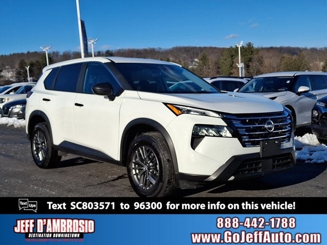 2025 Nissan Rogue S in Glacier White with Charcoal Cloth.