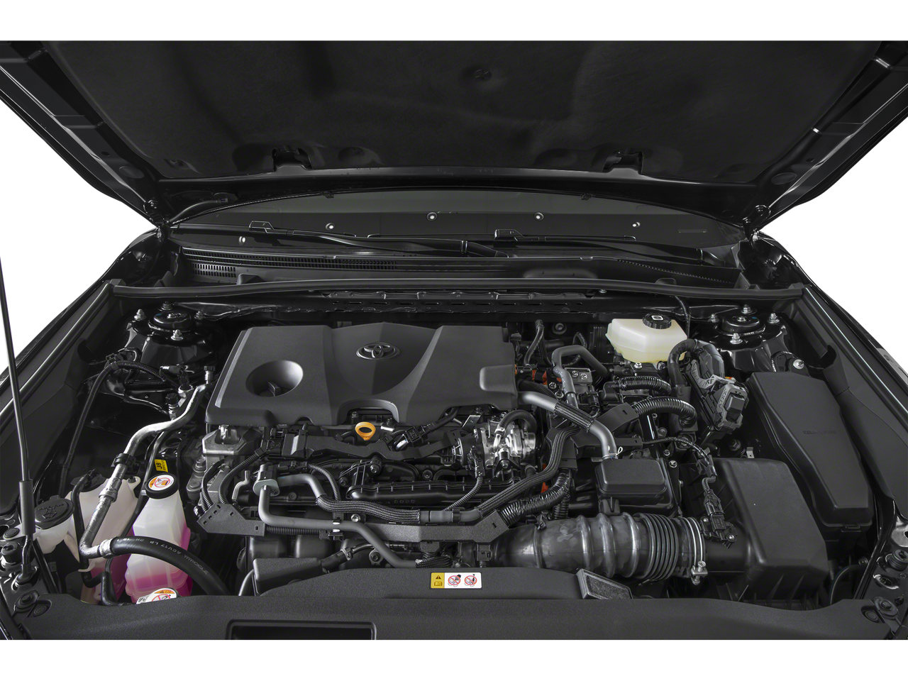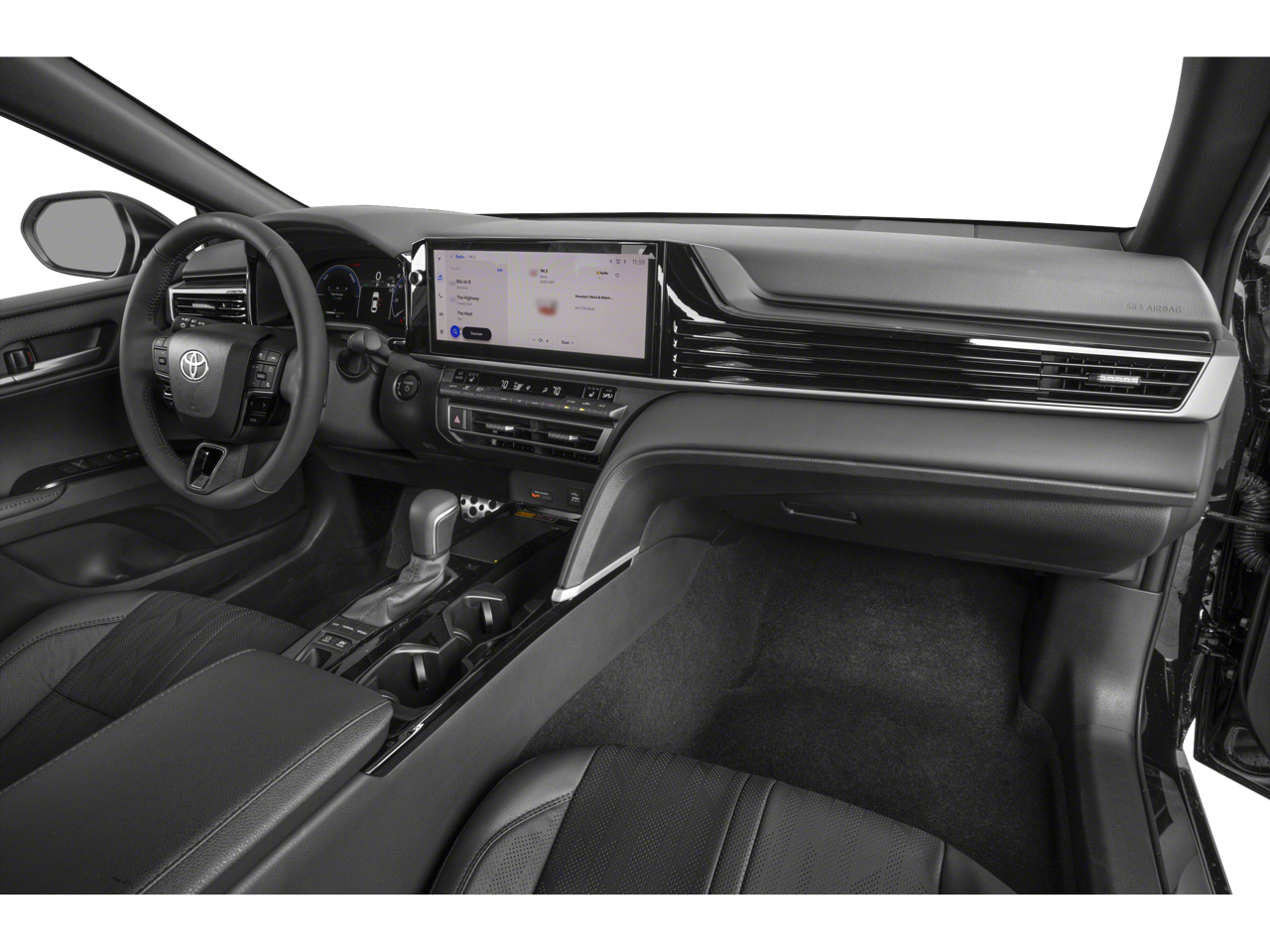 Below is all the standard equipment Black w/Leather Seat Trim, Panoramic Glass Roof, 4-Wheel Disc Brakes, 6 Speakers, ABS brakes, Air Conditioning, Alloy wheels, AM/FM radio: SiriusXM, Apple CarPlay/Android Auto, Auto High-beam Headlights, Auto-dimming Rear-View mirror, Automatic temperature control, Brake assist, Bumpers: body-color, Delay-off headlights, Driver door bin, Driver vanity mirror, Dual front impact airbags, Dual front side impact airbags, Electronic Stability Control, Emergency communication system: Safety Connect (5-year trial), Exterior Parking Camera Rear, Four wheel independent suspension, Front anti-roll bar, Front Bucket Seats, Front Center Armrest, Front dual zone A/C, Front reading lights, Fully automatic headlights, Garage door transmitter: HomeLink, Heated door mirrors, Heated Front Seats, Heated front seats, Heated steering wheel, Illuminated entry, Knee airbag, Leather Seat Trim, Leather Shift Knob, Leather steering wheel, Low tire pressure warning, Navigation system: Drive Connect (1 year trial) includes Cloud Navigation with real time traffic and Google POI, Occupant sensing airbag, Outside temperature display, Overhead airbag, Overhead console, Panic alarm, Passenger door bin, Passenger vanity mirror, Power door mirrors, Power driver seat, Power passenger seat, Power steering, Power windows, Radio data system, Radio: 12.3 Toyota Multimedia Audio, Rear anti-roll bar, Rear reading lights, Rear seat center armrest, Rear window defroster, Remote keyless entry, Security system, Speed control, Speed-sensing steering, Split folding rear seat, Spoiler, Steering wheel mounted audio controls, Telescoping steering wheel, Tilt steering wheel, Traction control, Trip computer, Turn signal indicator mirrors, Variably intermittent wipers, and Wheels: 19 Smoked Gray and Black-Finished Alloy.